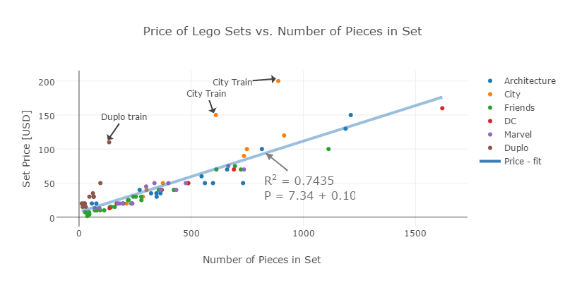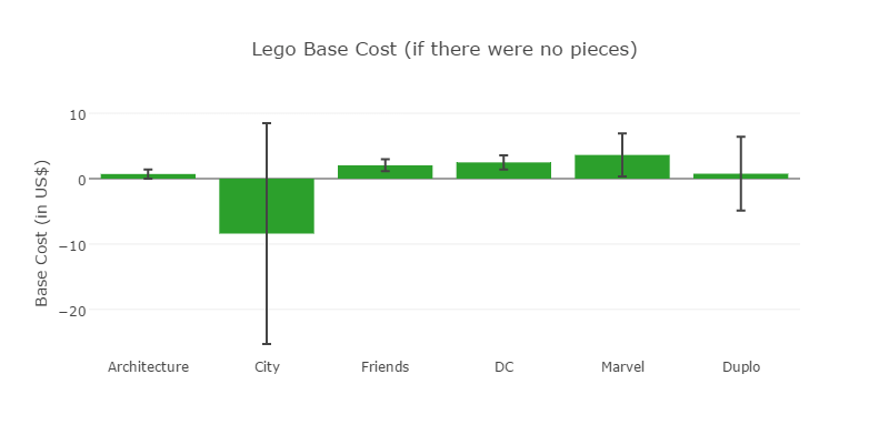 Here you will notice that the City theme has a negative base cost. This means that if there were no pieces (on average) in a City set, Lego would pay YOU money. But why is this negative? It’s because of the high price of the train sets. They increase the slope of the linear fit but also push the y-intercept into negative values.