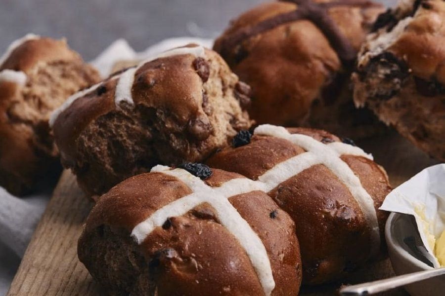 Make Paste for crosses: Combine flour, sugar and 2 tablespoons of cold water in a bowl. Spoon the paste into a snap-lock bag and seal the bag. Snip 1 corner from bag. Pipe crosses onto the top of each bun. Bake for 20-30 minutes at 180°C (160°C fan-forced) until the buns are golden-brown and cooked through.