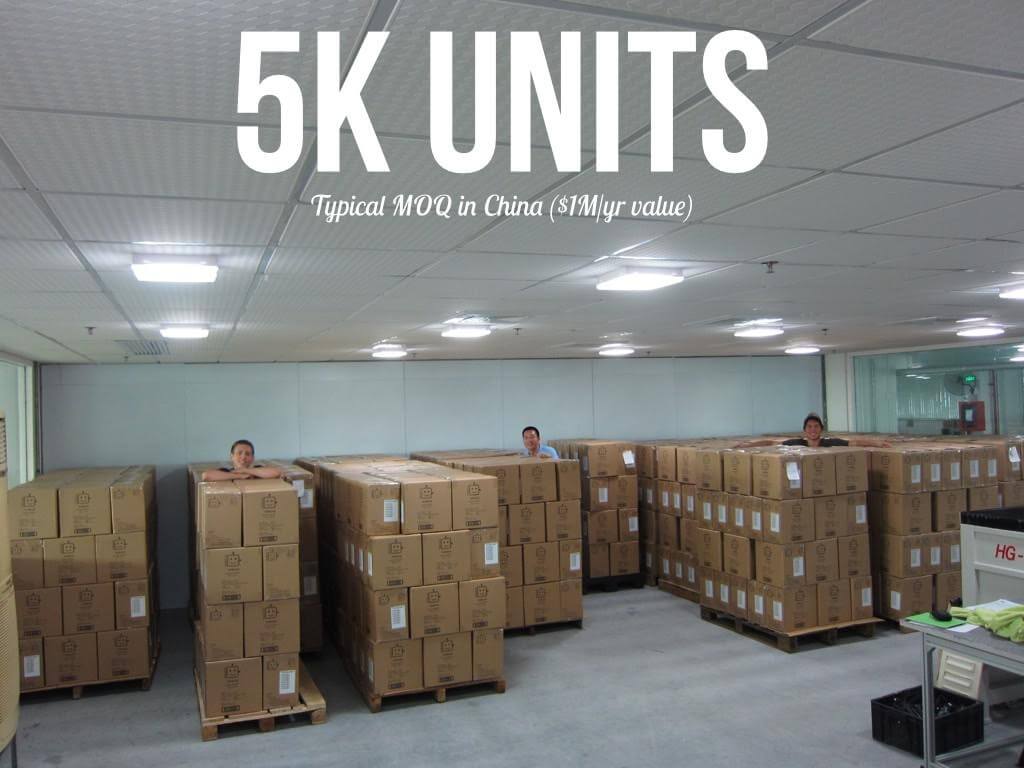 Most Chinese contract manufactures (CMs) have a minimum order quantity (MOQ) of 5k units. More importantly, these CMs want to see a lot of growth (ie: your second production run is 10k units, your third is 20k, and so on). What really drives this is the total pass-through cost of product rolling through their facility. In the first year of production, a typical CM would like to see $1M worth of BOM leaving their factory for each customer. So if you’re building a really expensive product (like a 3D printer) a smaller MOQ is often okay.