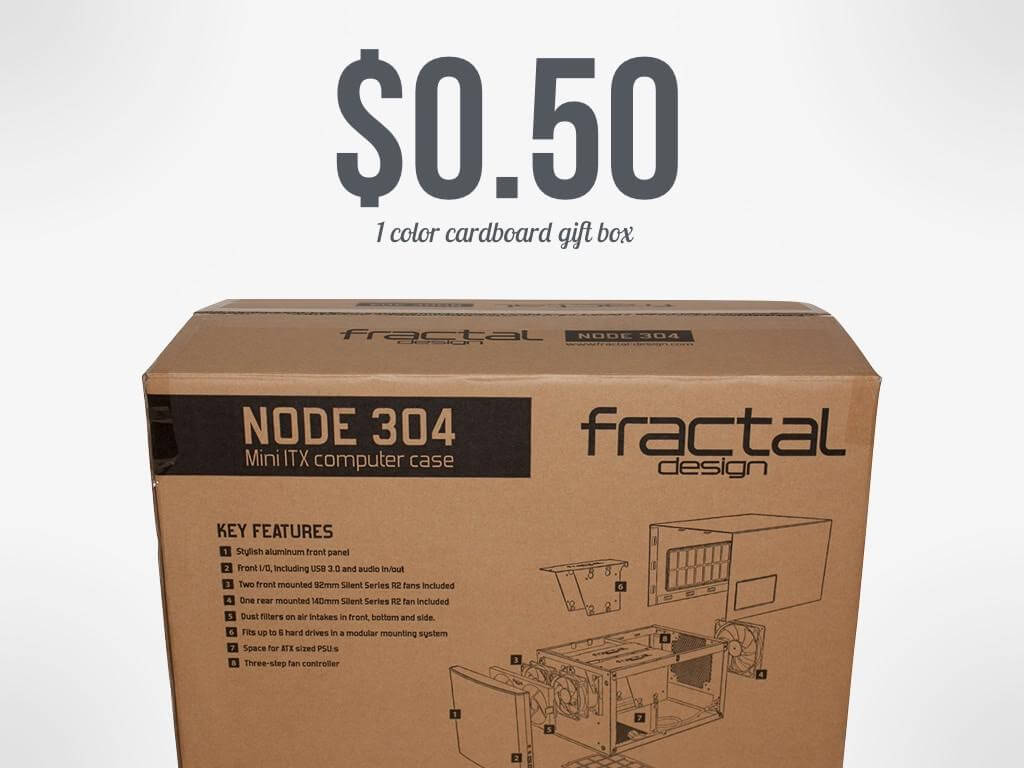Each product comes in a cardboard box (often called a gift box). Basic single color boxes like the one pictured will usually cost $0.25 to $0.50 per box.