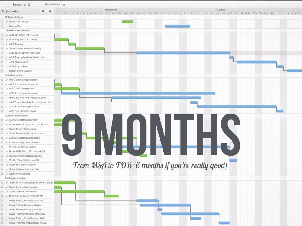 Most CMs will quote around 180 days from database release (when you send the ‘final’ design to them) and when the product transfers ownership from the CM to you (typically called Freight On Board or FOB). Unless you’ve gone through the process before, it usually takes at least 50% longer than that and often stretches into 1 year territory. There are many ways to decrease this time, but most of them require capital, expertise, or huge focus from the founding team.